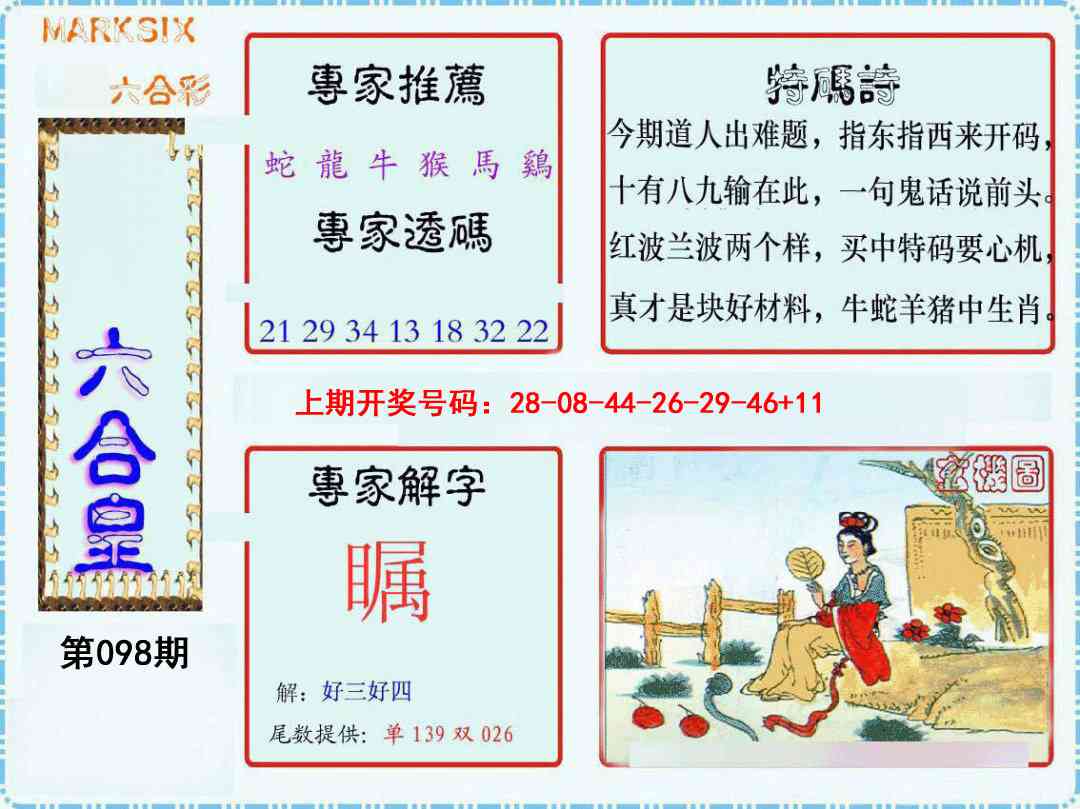 098期: 澳门六合彩彩圖信封【特码诗句】每期自动更新